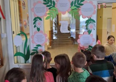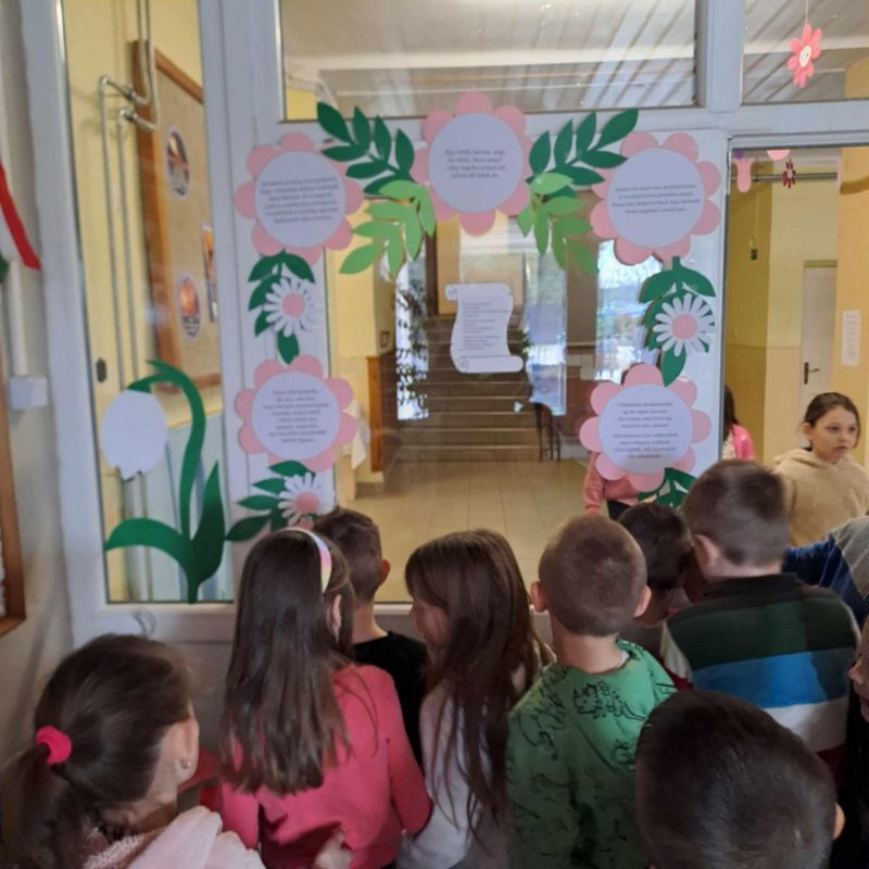 A bejáratnál szervező kolléganőm, Lengyel Anna tanító néni szépséges Verskapuja fogadta az iskolánkba érkezőket virágos jókedvet teremtve. A nap folyamán örömmel hallgattam az osztályokat, ahogyan itt verselnek, énekelnek.
