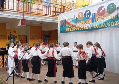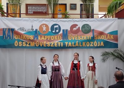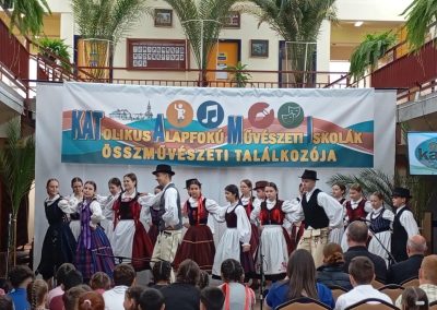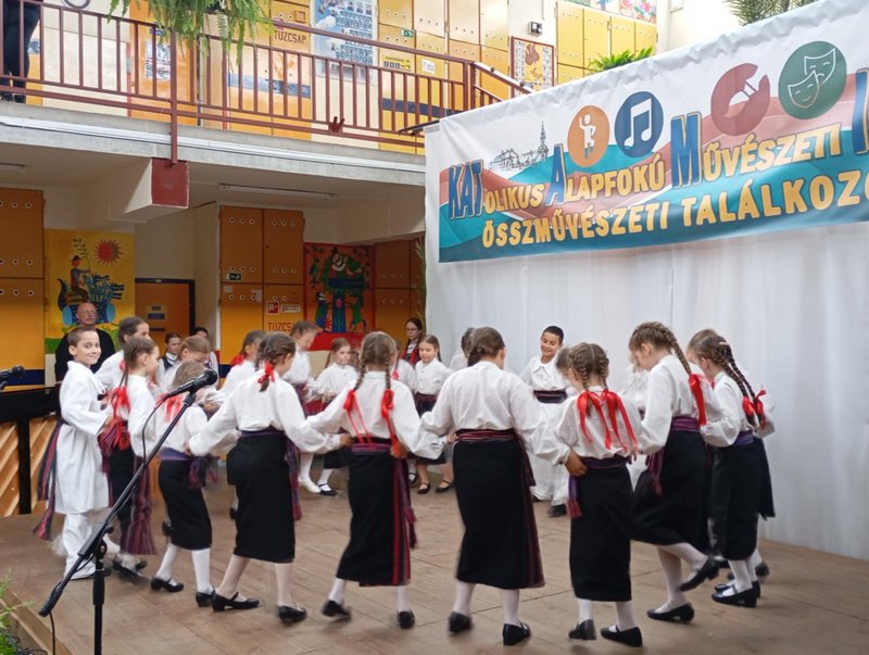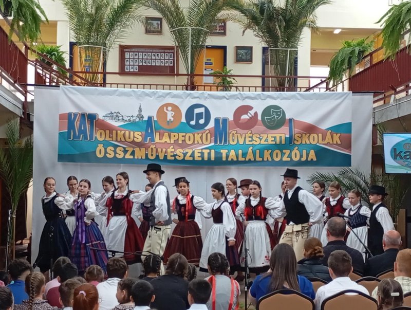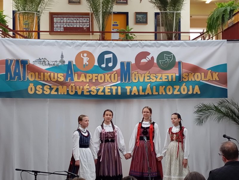 Első alkalommal rendezték meg az Egri Főegyházmegye támogatásával, Dr. Ternyák Csaba érsek atya fővédnökségével az Alapfokú Művészeti Iskolák Összművészeti Találkozóját. Az eseménynek – melyen kilenc intézmény mutathatta be művészeti tevékenységét – Sajólád adott otthont. Iskolánkat Buchala István tanár úr fényképes beszámolója által ismerhették meg az érdeklődők, Maier Reimond és Dr. Krupárné Rakaczki Anna táncpedagógusaink felkészítésével pedig néptáncos növendékeink kápráztatták el a közönséget. A második évfolyamosok különös izgalommal érkeztek a helyszínre, hiszen ez volt az első nagyobb megmérettetésük. Igazi csapatépítés volt, ahogyan idősebb társaik patronálták a kicsiket. Így, együtt, összefogva vitték jó hírünket a tánc és az ének nyelvén az alábbi összeállítással: